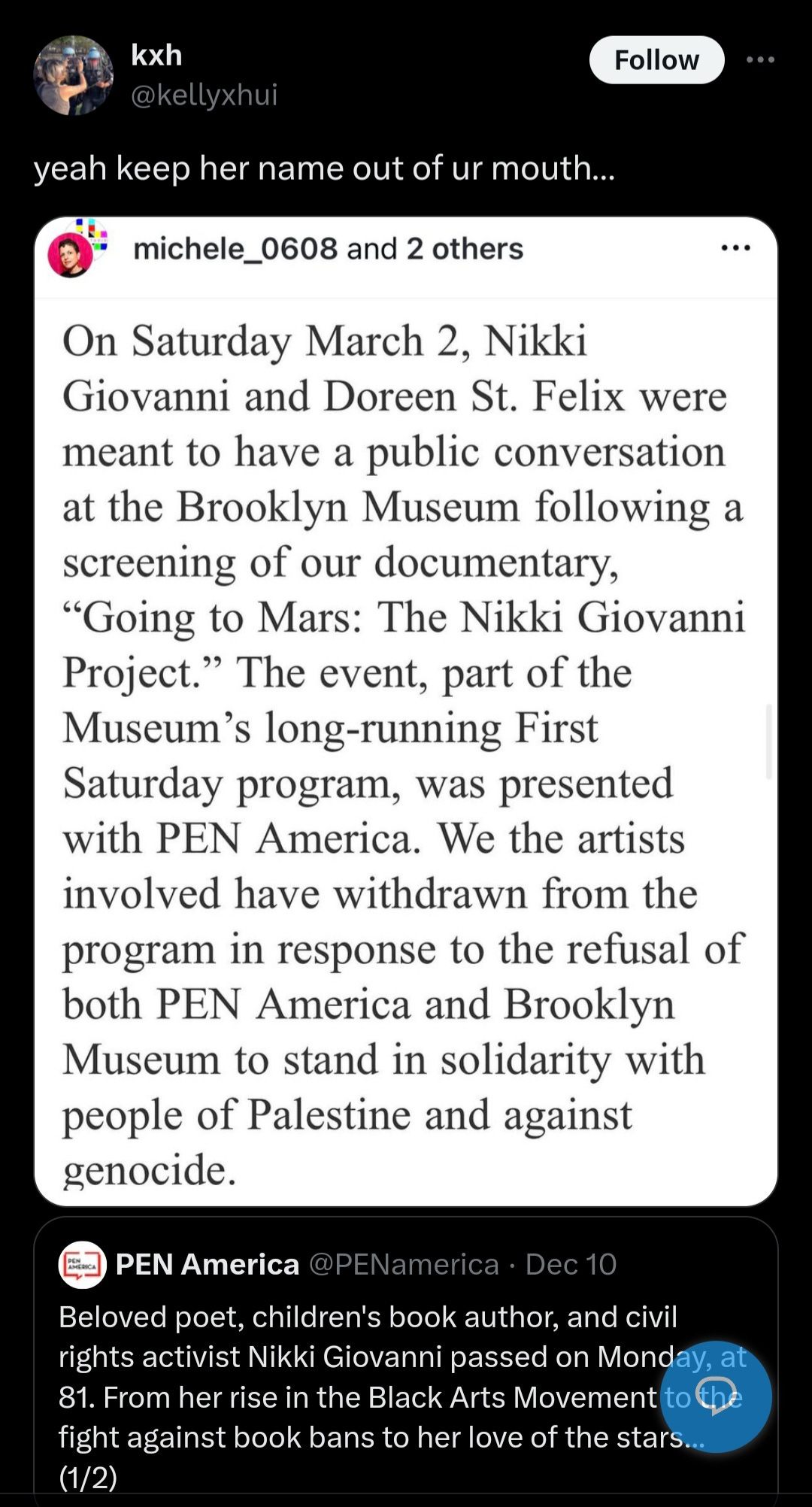 One of the last things Nikki Giovanni did this year publicly is call off her talk hosted by Pen America, who have failed despite numerous entreaties to give a public stance on Israel's genocide.